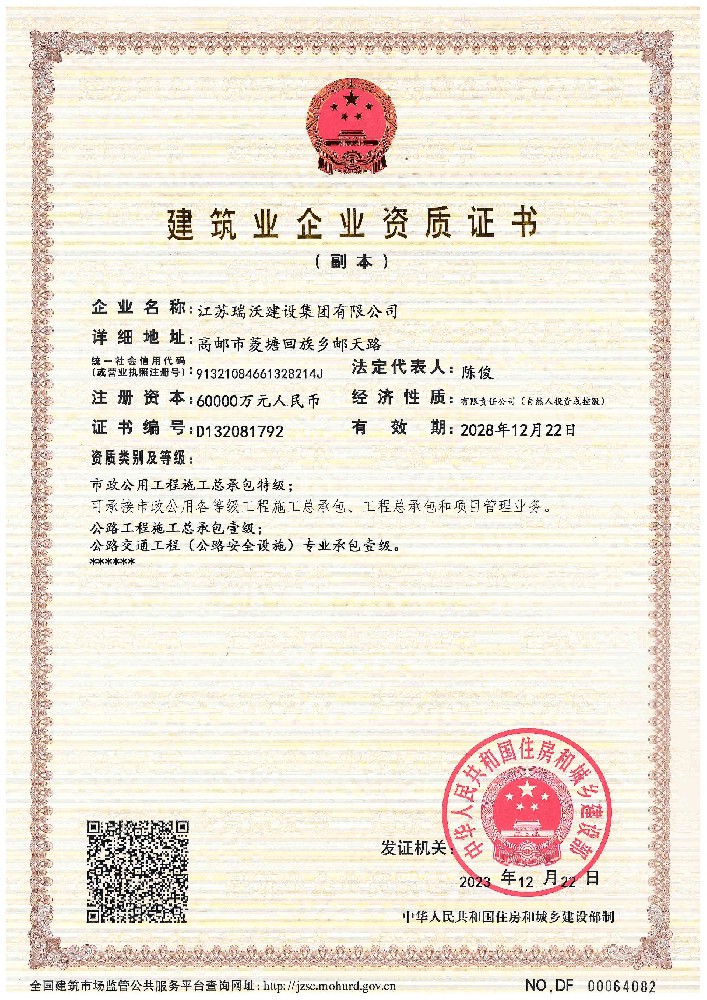 江蘇瑞沃建設(shè)集團(tuán)有限公司成立于2007年,是一家以市政、交通工程建設(shè)為主導(dǎo),集房屋建筑、交通安全設(shè)施、城市道路照明工程、電力工程、隧道工程、航道工程及投融資為一體的綜合性企業(yè)。企業(yè)注冊(cè)資本60000萬元,現(xiàn)有各類技術(shù)人員580人,其中中、高級(jí)以上人員498人,注冊(cè)類人員268人,一、二級(jí)建造師166人。公司榮獲“江蘇省建筑業(yè)優(yōu)秀企業(yè)”、“江蘇省五一勞動(dòng)獎(jiǎng)狀”,連續(xù)多年被評(píng)為“揚(yáng)州市先進(jìn)企業(yè)”、“江蘇省建筑業(yè)百?gòu)?qiáng)企業(yè)”,連續(xù)八年蟬聯(lián)百?gòu)?qiáng)企業(yè)基礎(chǔ)設(shè)施類第一名。